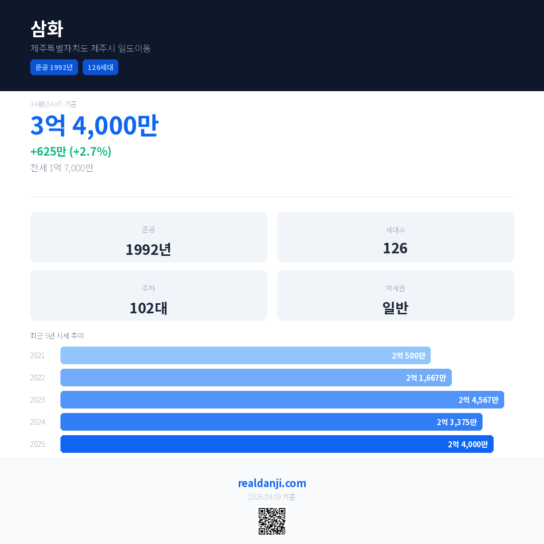 삼화 국민평형 기준 2025년 평균 거래가는 2억 4,000만으로, 전년 대비 2.7% 상승 했습니다.