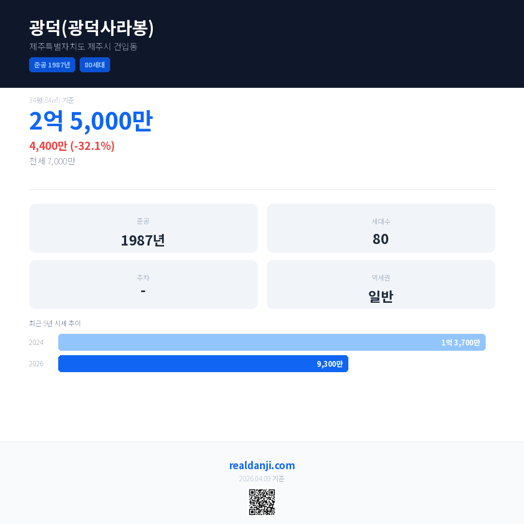 광덕(광덕사라봉) 국민평형 기준 2026년 평균 거래가는 9,300만으로, 전년 대비 32.1% 하락 했습니다.