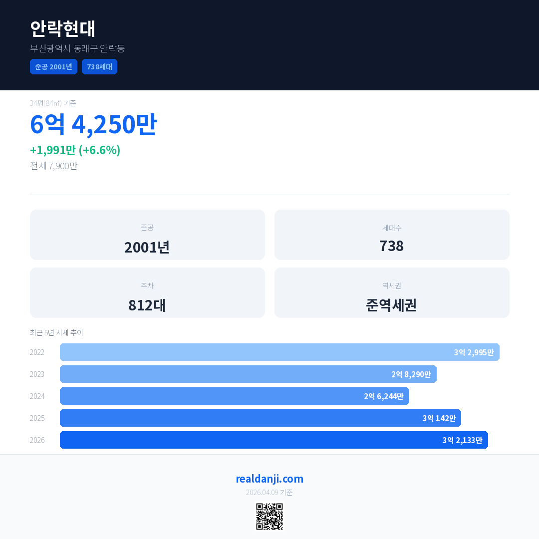 안락현대 최근 거래가는 6억 4,250만입니다. (2026-03)