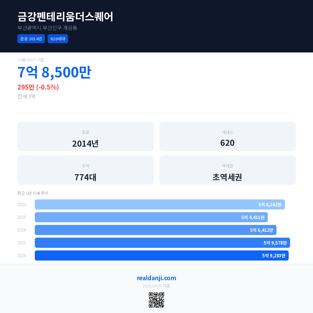 금강펜테리움더스퀘어 국민평형 기준 2026년 평균 거래가는 5억 9,283만으로, 전년 대비 0.5% 하락 했습니다.