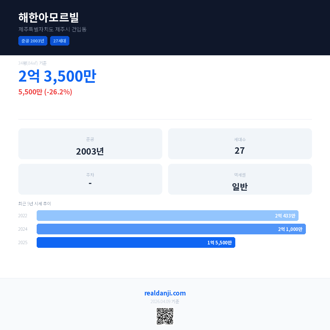 해한아모르빌은(는) 2003년에 준공되었으며, 현재 23년차입니다. 총 27세대 규모입니다.