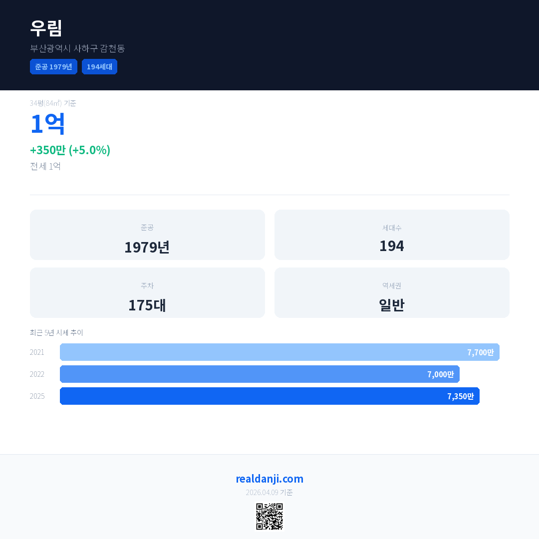 우림 국민평형 기준 2025년 평균 거래가는 7,350만으로, 전년 대비 5.0% 상승 했습니다.