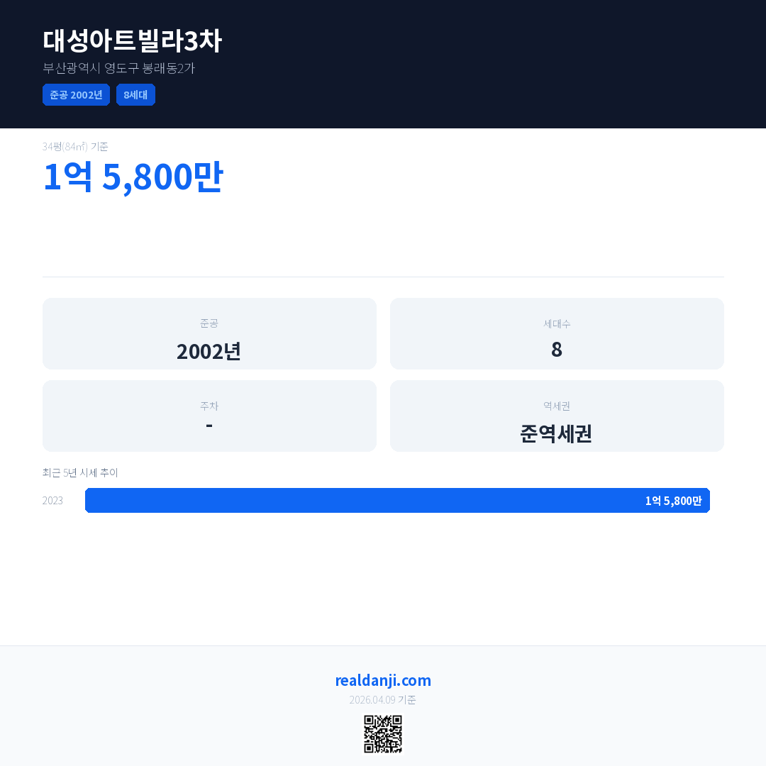 대성아트빌라3차 최근 거래가는 1억 5,800만입니다. (2023-04)
