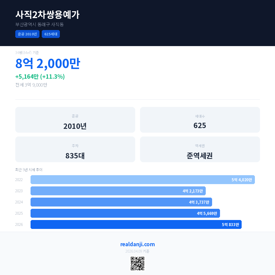 사직2차쌍용예가 국민평형 기준 2026년 평균 거래가는 5억 833만으로, 전년 대비 11.3% 상승 했습니다.
