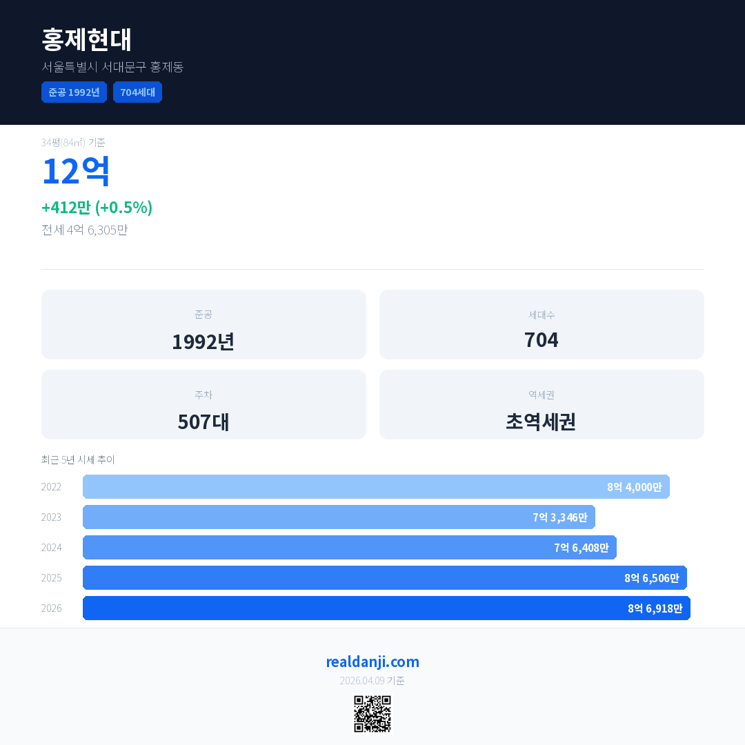 홍제현대 최근 거래가는 12억입니다. (2026-04)