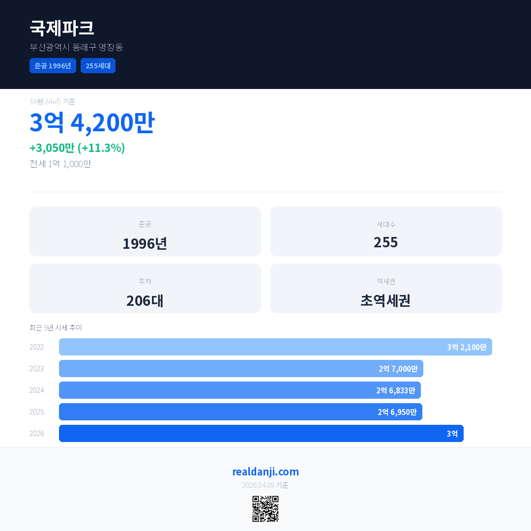 국제파크 국민평형 기준 2026년 평균 거래가는 3억으로, 전년 대비 11.3% 상승 했습니다.