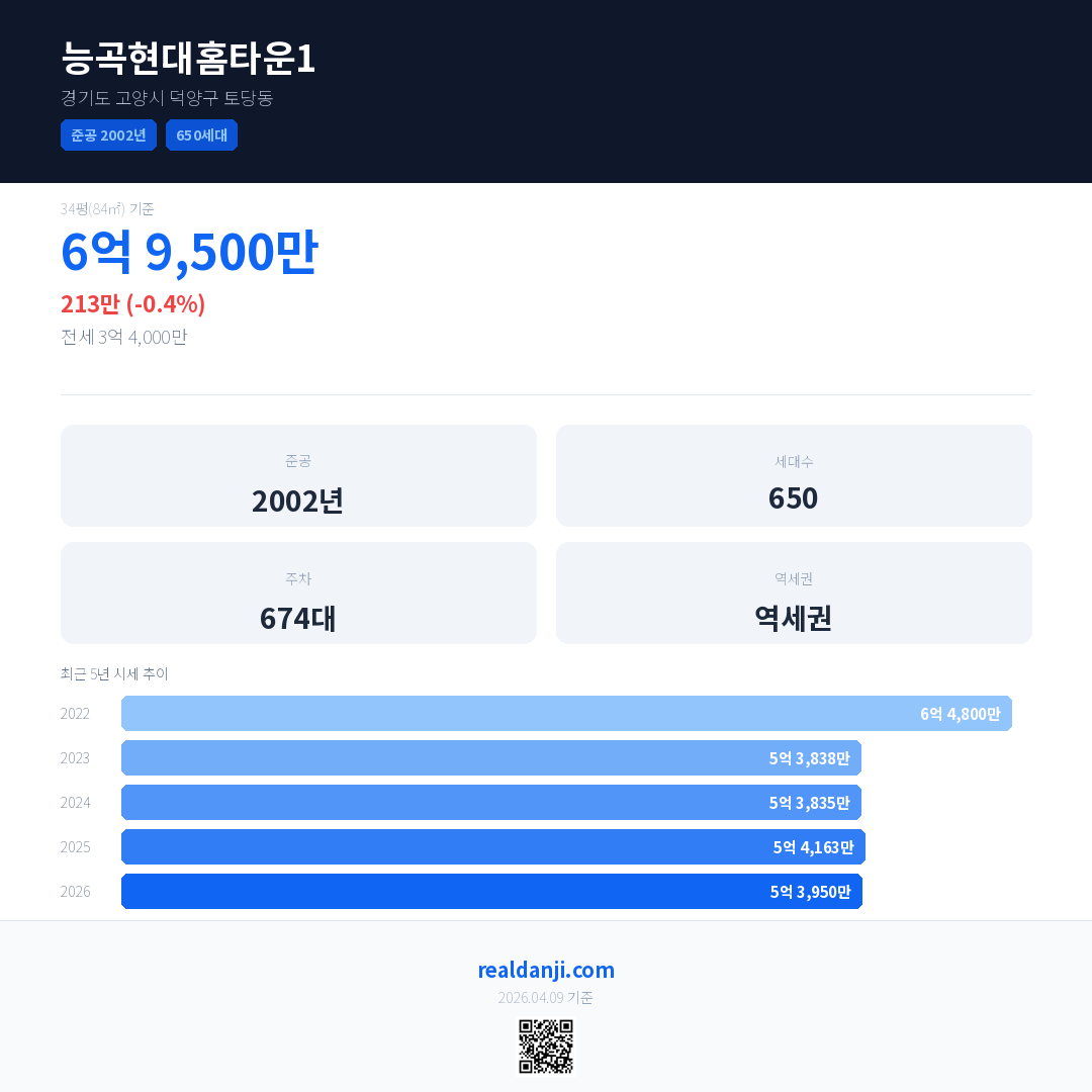 능곡현대홈타운1 최근 거래가는 6억 9,500만입니다. (2026-04)