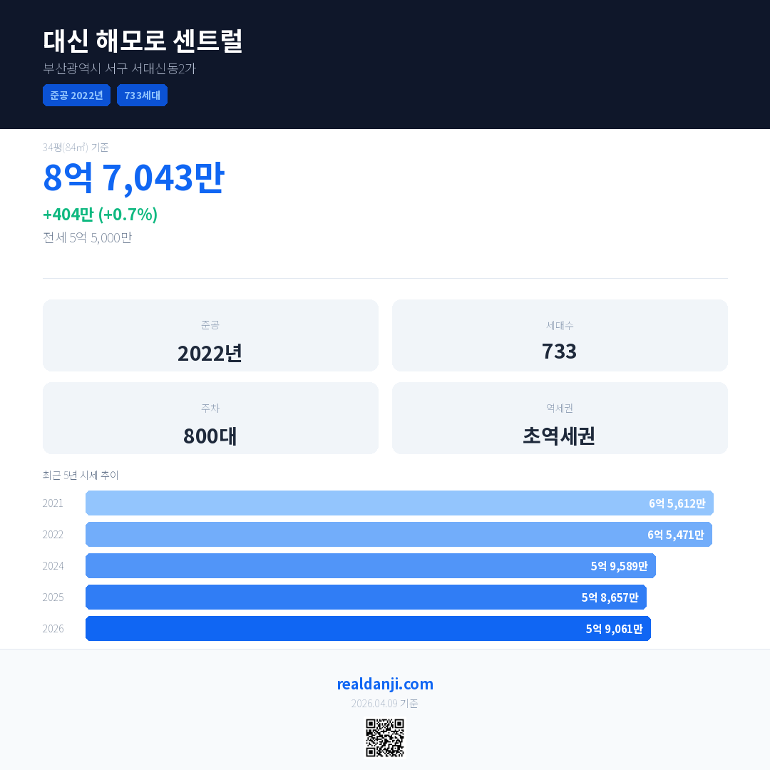 대신 해모로 센트럴은(는) 2022년에 준공되었으며, 현재 4년차입니다. 총 733세대 규모입니다.