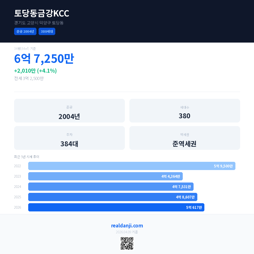 토당동금강KCC 국민평형 기준 2026년 평균 거래가는 5억 617만으로, 전년 대비 4.1% 상승 했습니다.