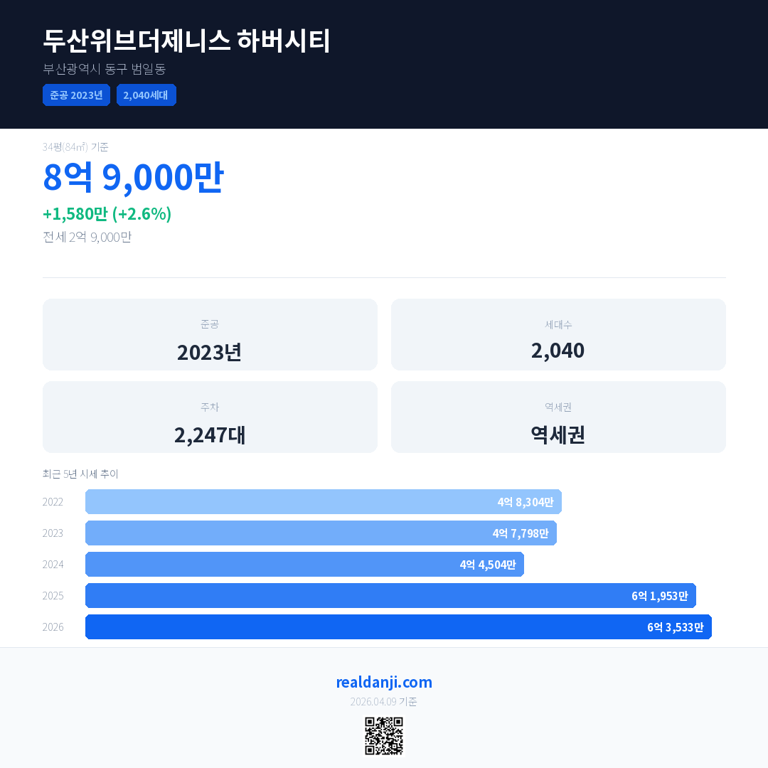 두산위브더제니스 하버시티 국민평형 기준 2026년 평균 거래가는 6억 3,533만으로, 전년 대비 2.6% 상승 했습니다.