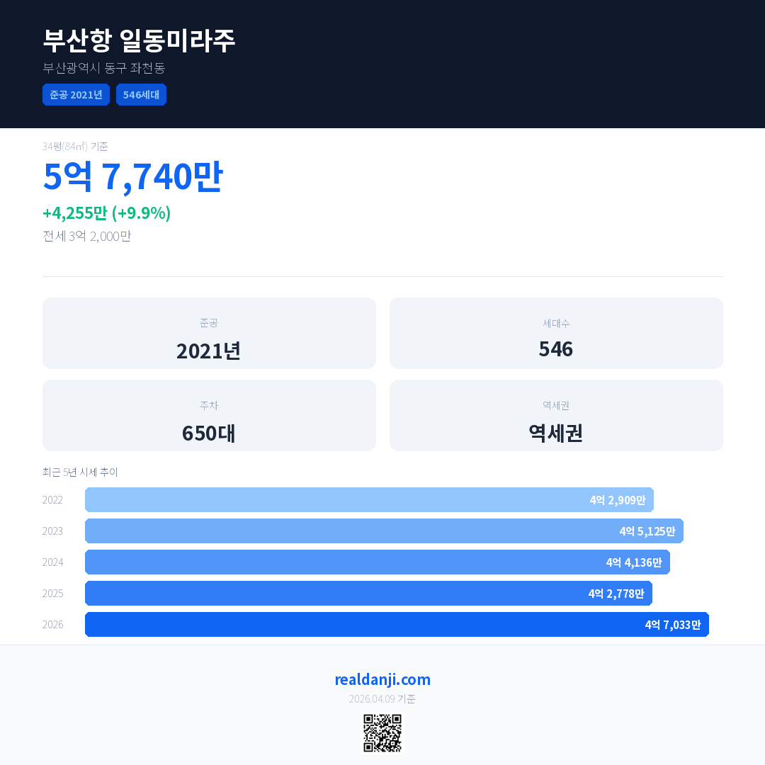 부산항 일동미라주 최근 거래가는 5억 7,740만입니다. (2026-03)