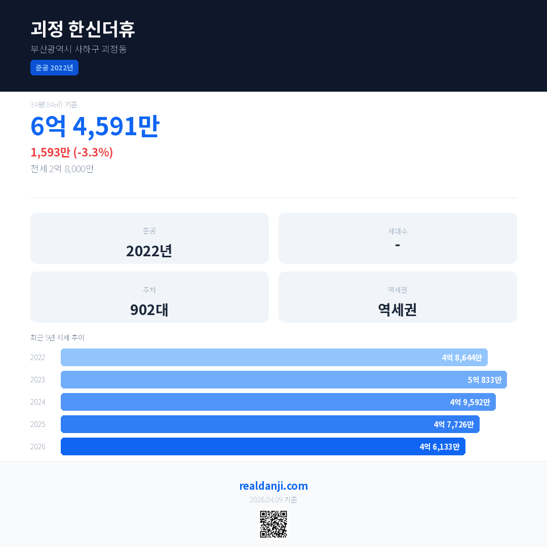괴정 한신더휴 최근 거래가는 6억 4,591만입니다. (2026-04)