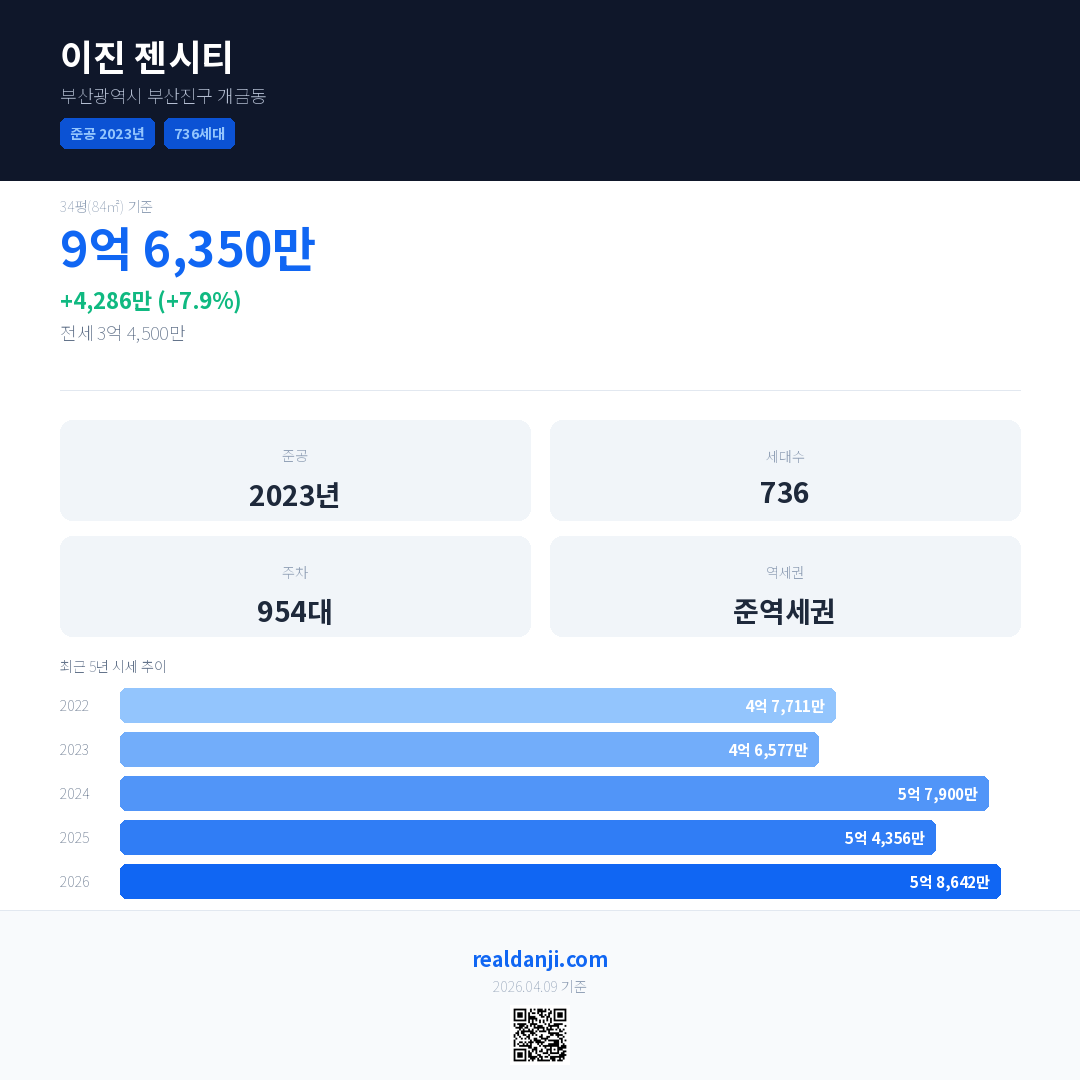 이진 젠시티 최근 거래가는 9억 6,350만입니다. (2026-03)