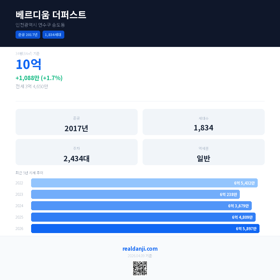 베르디움 더퍼스트 국민평형 기준 2026년 평균 거래가는 6억 5,897만으로, 전년 대비 1.7% 상승 했습니다.