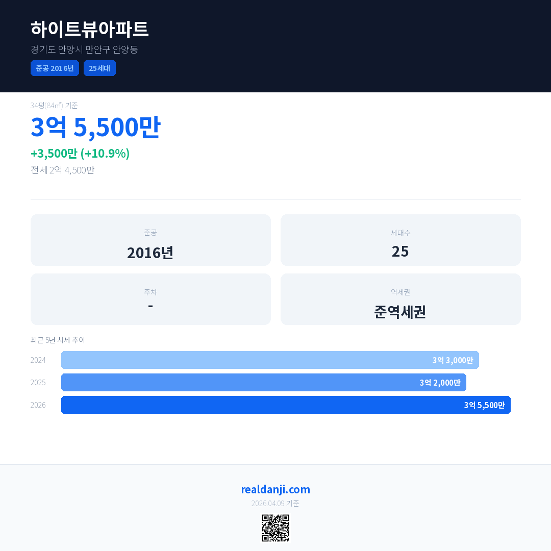 하이트뷰아파트 최근 거래가는 3억 5,500만입니다. (2025-04)