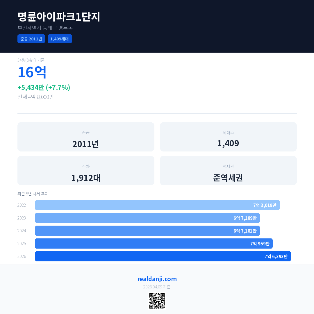 명륜아이파크1단지 국민평형 기준 2026년 평균 거래가는 7억 6,393만으로, 전년 대비 7.7% 상승 했습니다.