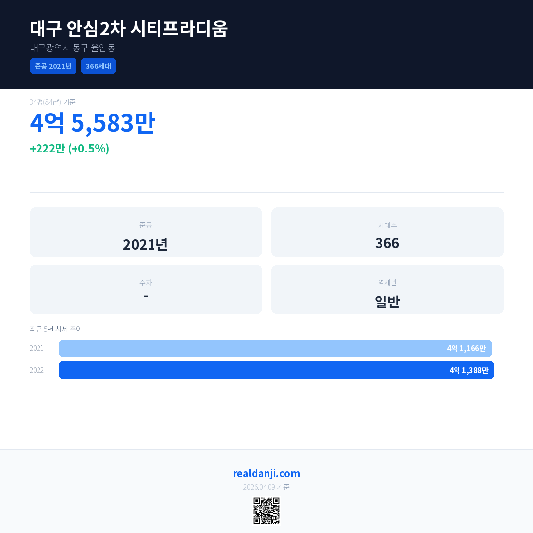대구 안심2차 시티프라디움 최근 거래가는 4억 5,583만입니다. (2022-08)