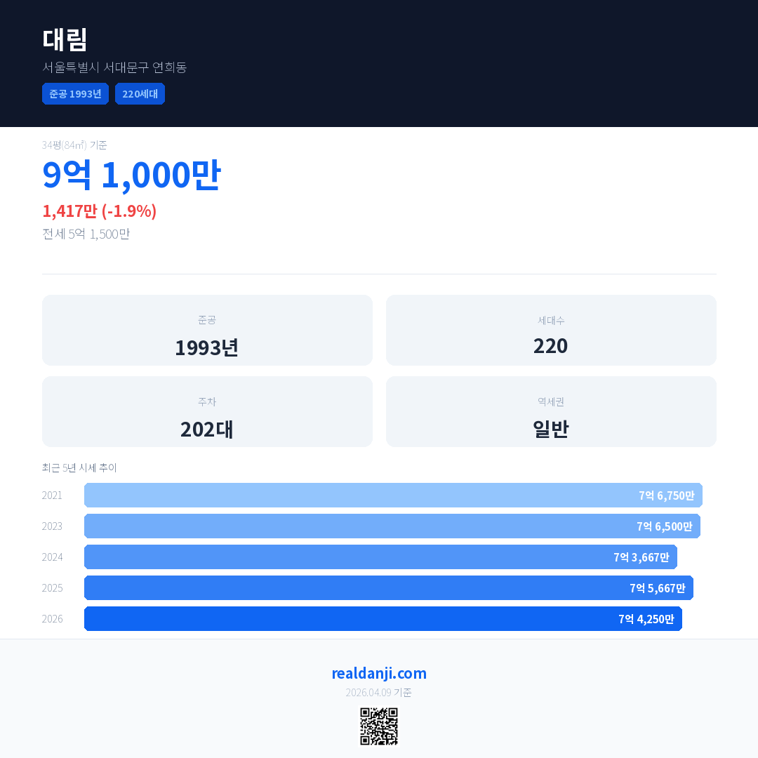 대림은(는) 1993년에 준공되었으며, 현재 33년차입니다. 총 220세대 규모입니다.