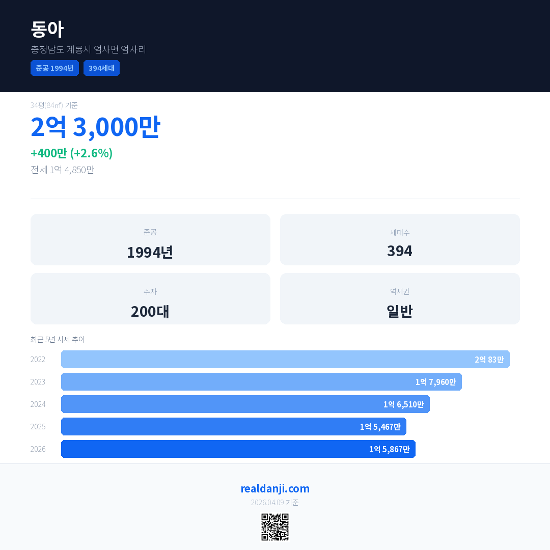 동아 국민평형 기준 2026년 평균 거래가는 1억 5,867만으로, 전년 대비 2.6% 상승 했습니다.