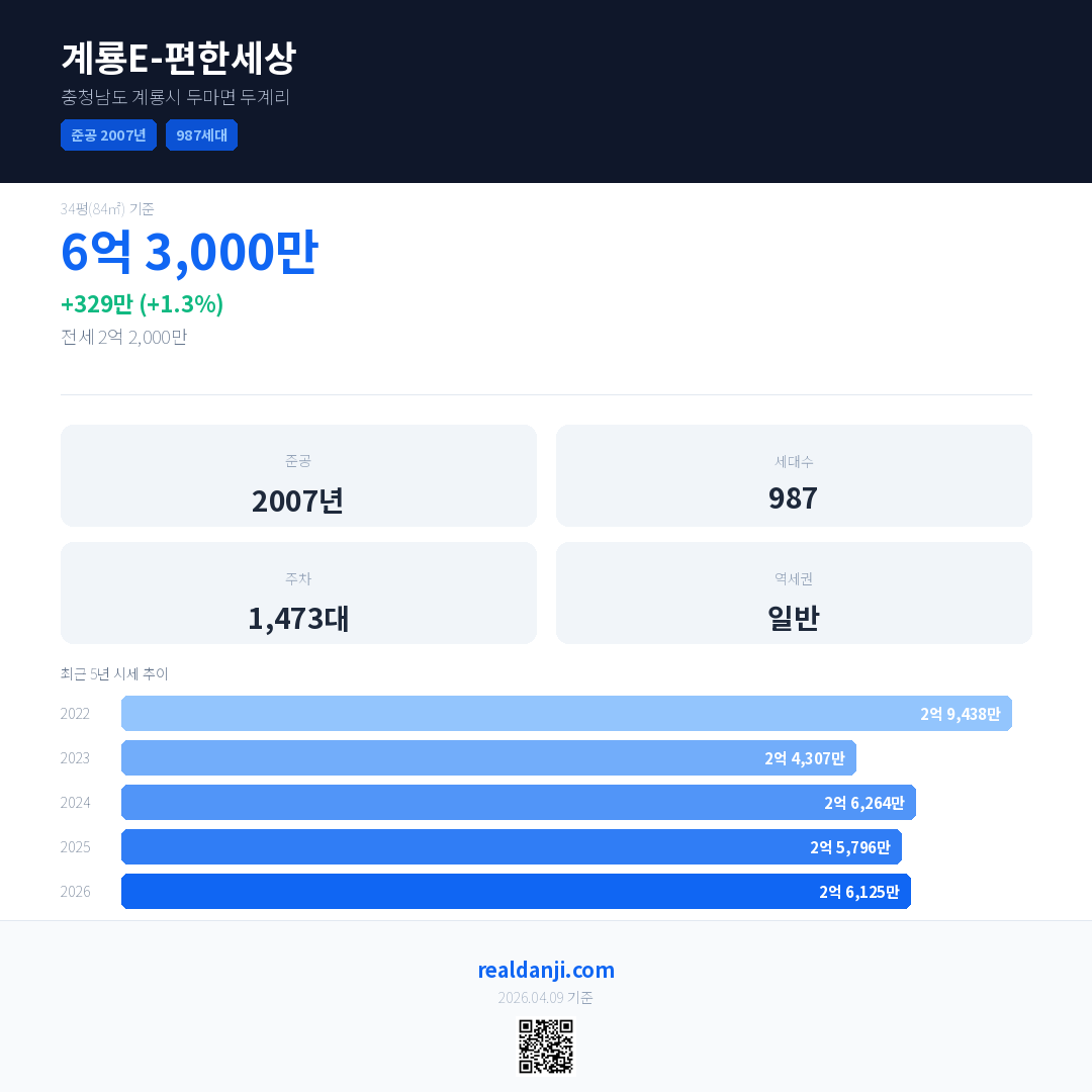 계룡E-편한세상 국민평형 기준 2026년 평균 거래가는 2억 6,125만으로, 전년 대비 1.3% 상승 했습니다.