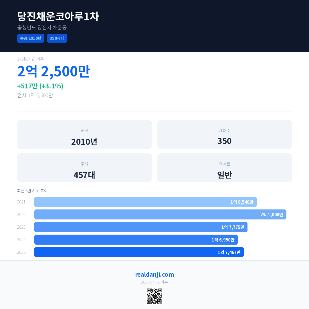 당진채운코아루1차 국민평형 기준 2025년 평균 거래가는 1억 7,467만으로, 전년 대비 3.1% 상승 했습니다.