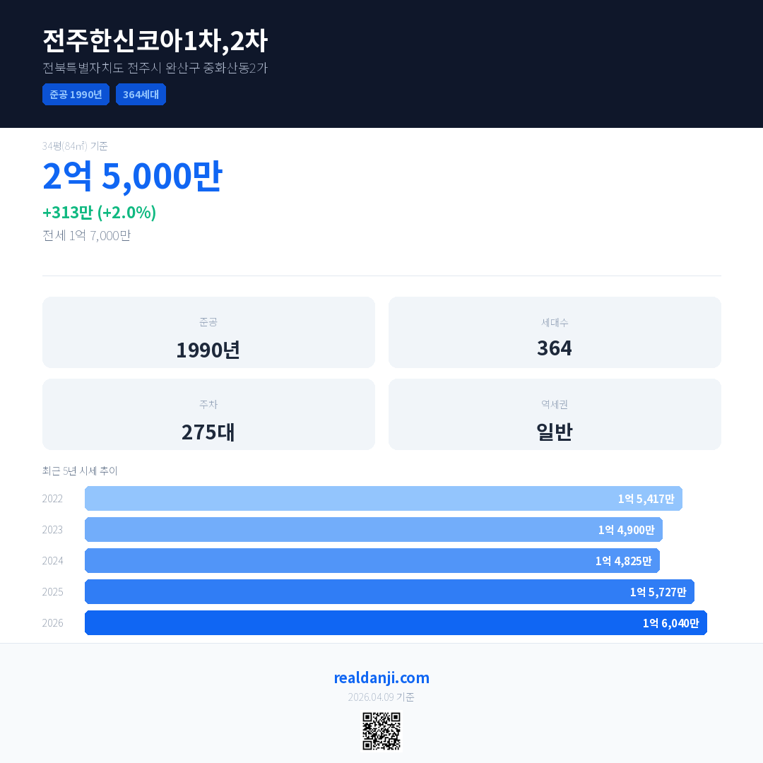 전주한신코아1차,2차 국민평형 기준 2026년 평균 거래가는 1억 6,040만으로, 전년 대비 2.0% 상승 했습니다.