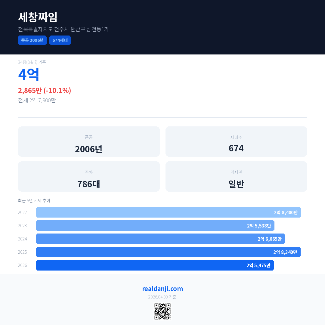 세창짜임 최근 거래가는 4억입니다. (2026-04)