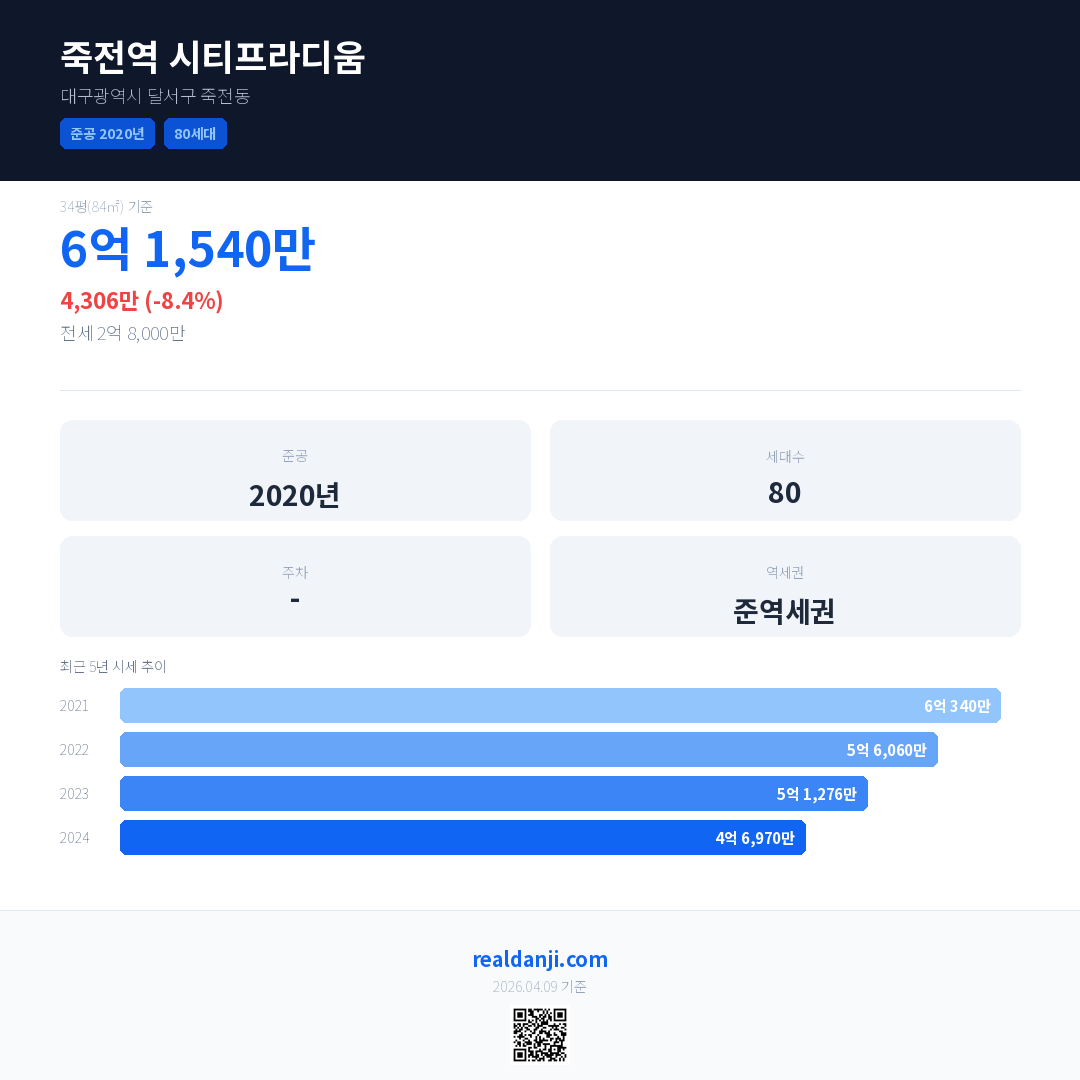 죽전역 시티프라디움은(는) 2020년에 준공되었으며, 현재 6년차입니다. 총 80세대 규모입니다.