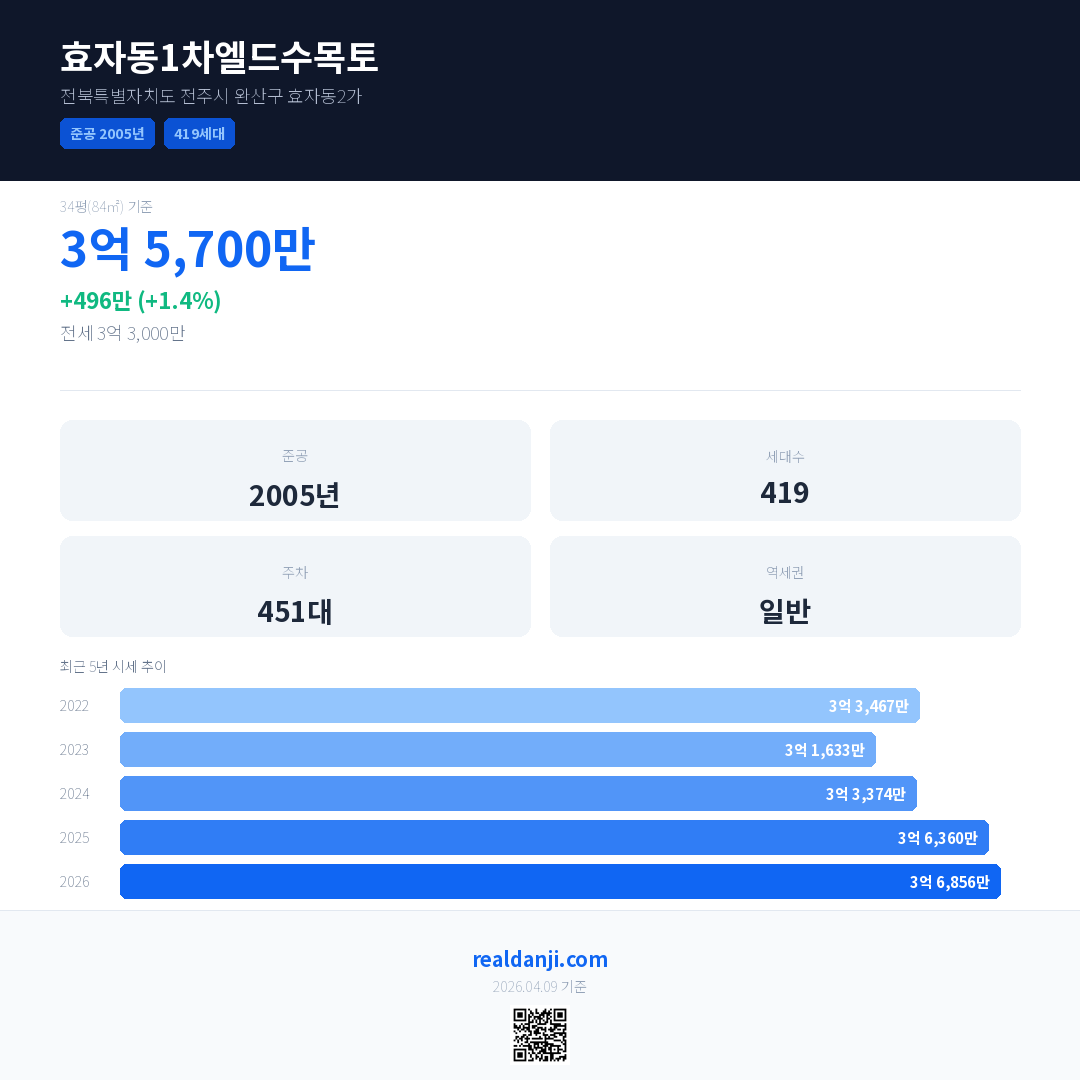 효자동1차엘드수목토 국민평형 기준 2026년 평균 거래가는 3억 6,856만으로, 전년 대비 1.4% 상승 했습니다.