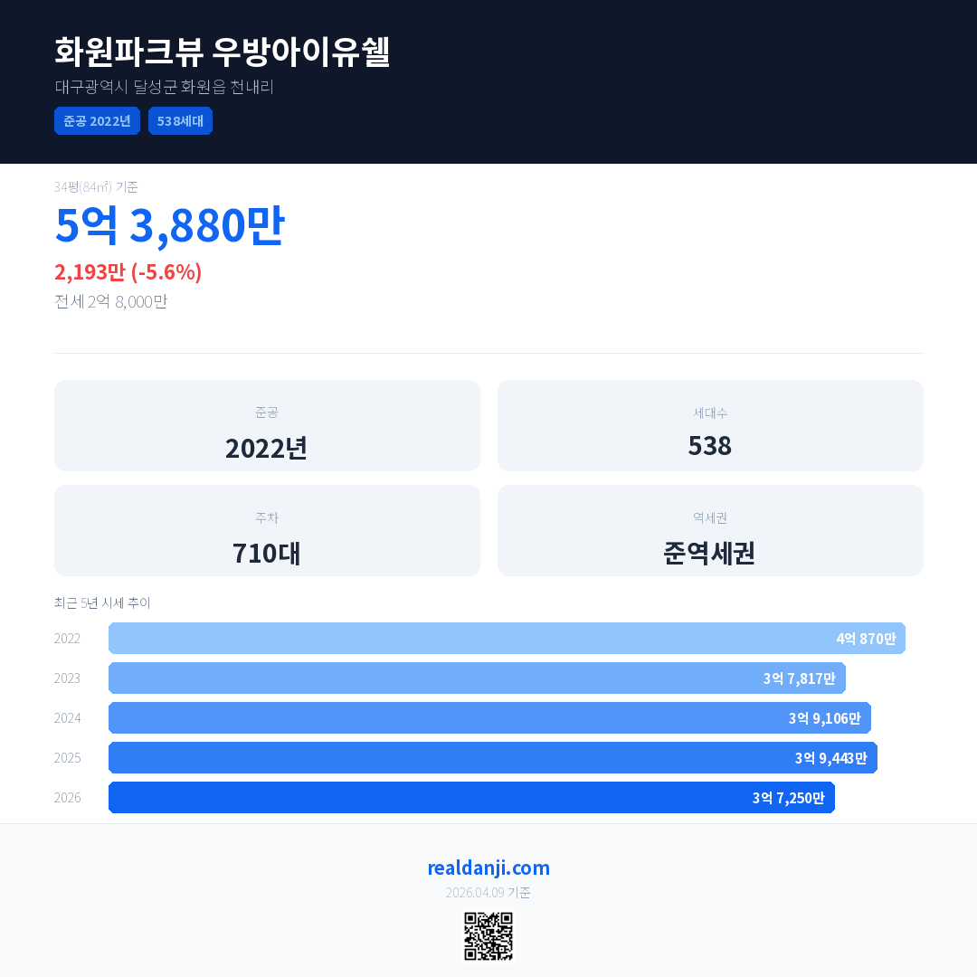 화원파크뷰 우방아이유쉘 최근 거래가는 5억 3,880만입니다. (2026-03)