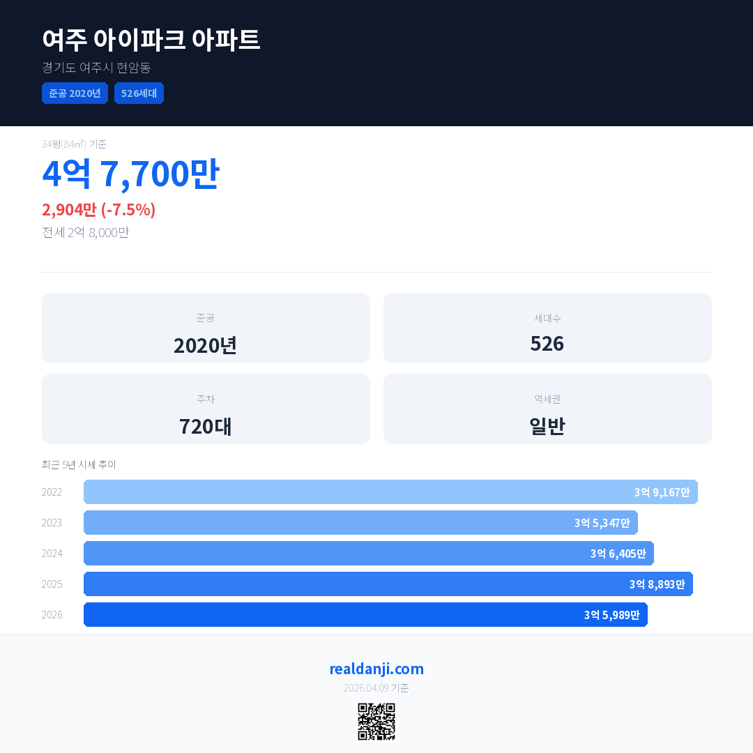 여주 아이파크 아파트 국민평형 기준 2026년 평균 거래가는 3억 5,989만으로, 전년 대비 7.5% 하락 했습니다.