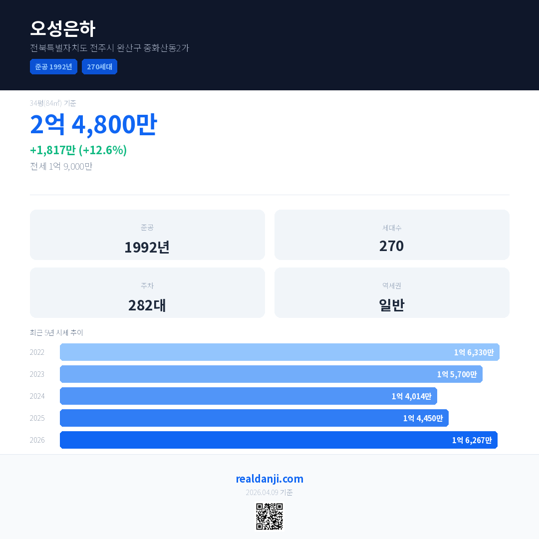 오성은하 국민평형 기준 2026년 평균 거래가는 1억 6,267만으로, 전년 대비 12.6% 상승 했습니다.