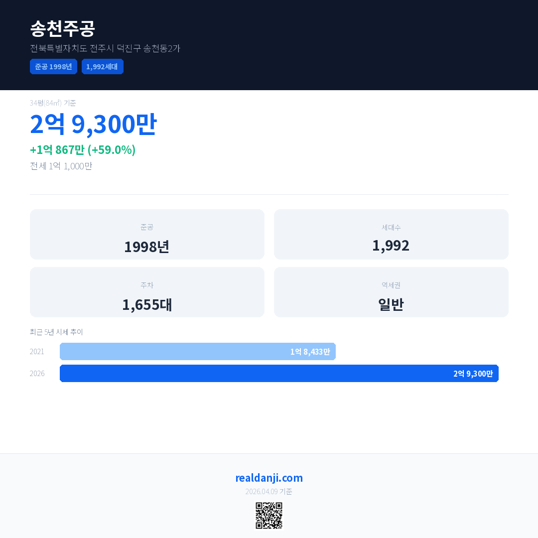 송천주공 최근 거래가는 1억 8,700만입니다. (2026-04)