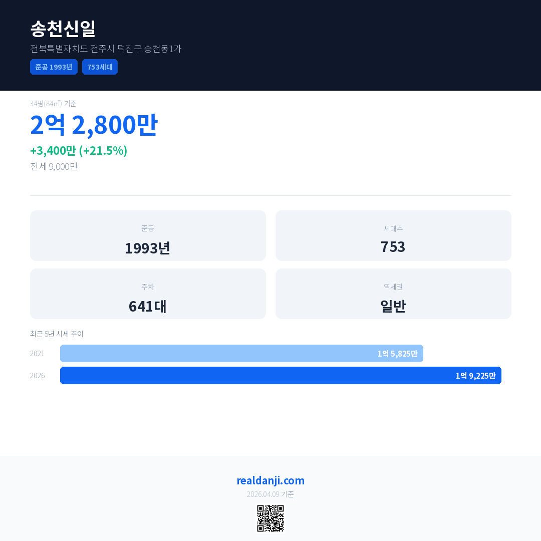 송천신일 국민평형 기준 2026년 평균 거래가는 1억 9,225만으로, 전년 대비 21.5% 상승 했습니다.