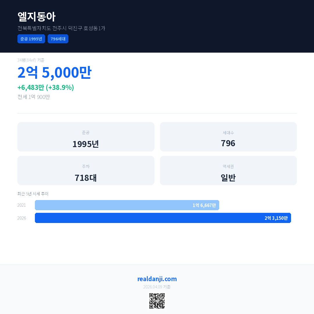 엘지동아 국민평형 기준 2026년 평균 거래가는 2억 3,150만으로, 전년 대비 38.9% 상승 했습니다.