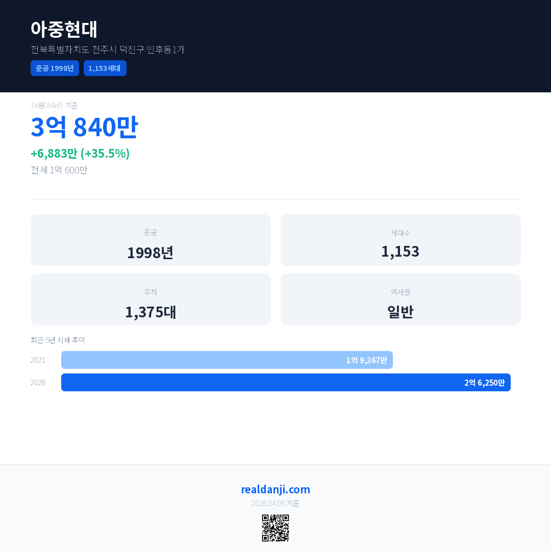 아중현대 국민평형 기준 2026년 평균 거래가는 2억 6,250만으로, 전년 대비 35.5% 상승 했습니다.