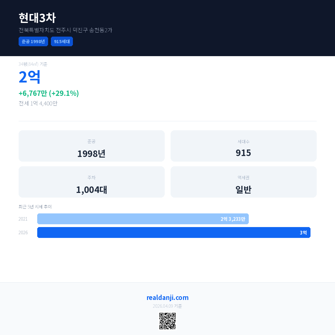 현대3차 국민평형 기준 2026년 평균 거래가는 3억으로, 전년 대비 29.1% 상승 했습니다.