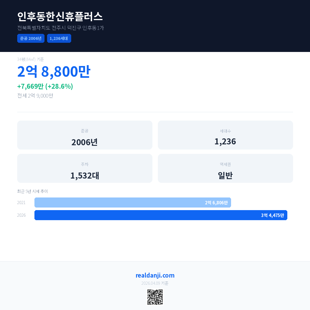 인후동한신휴플러스 국민평형 기준 2026년 평균 거래가는 3억 4,475만으로, 전년 대비 28.6% 상승 했습니다.