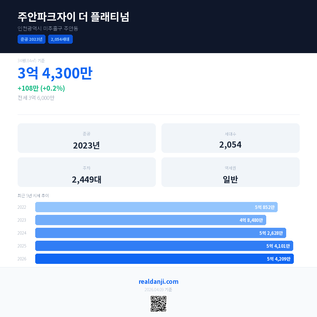 주안파크자이 더 플래티넘 국민평형 기준 2026년 평균 거래가는 5억 4,209만으로, 전년 대비 0.2% 상승 했습니다.