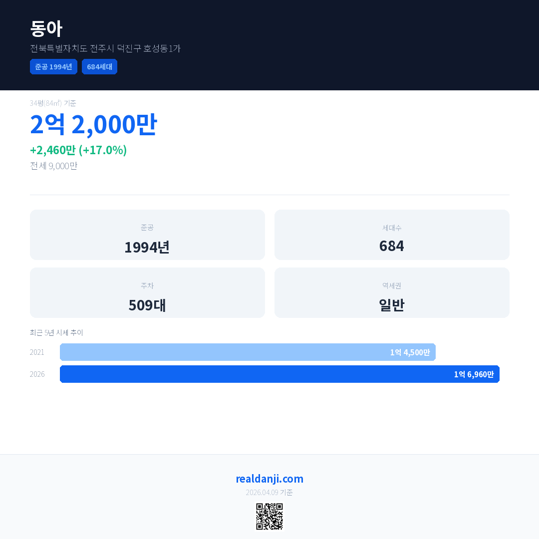 동아 국민평형 기준 2026년 평균 거래가는 1억 6,960만으로, 전년 대비 17.0% 상승 했습니다.