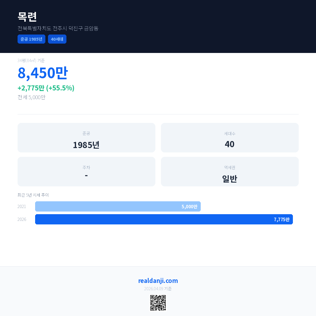 목련 국민평형 기준 2026년 평균 거래가는 7,775만으로, 전년 대비 55.5% 상승 했습니다.