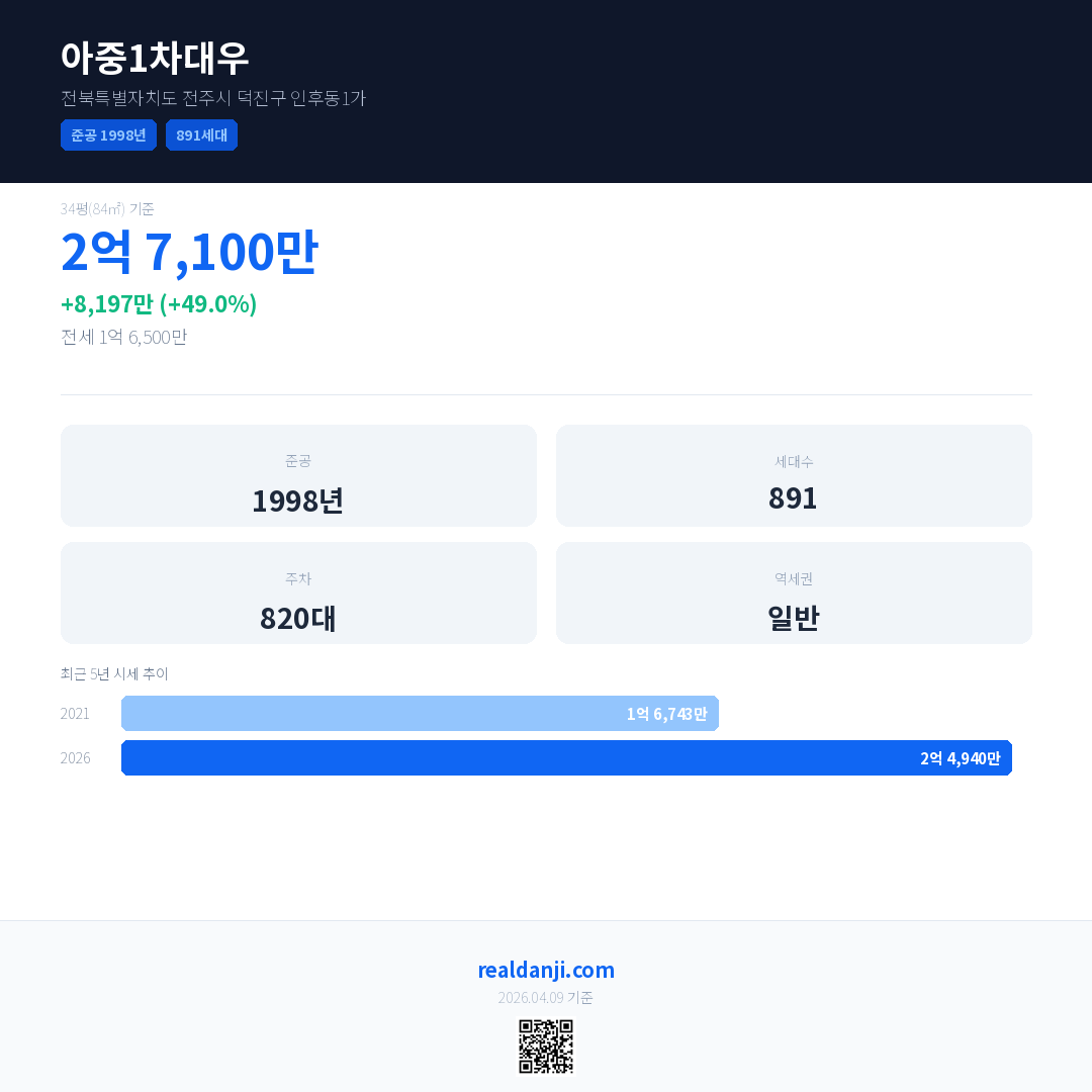 아중1차대우 국민평형 기준 2026년 평균 거래가는 2억 4,940만으로, 전년 대비 49.0% 상승 했습니다.
