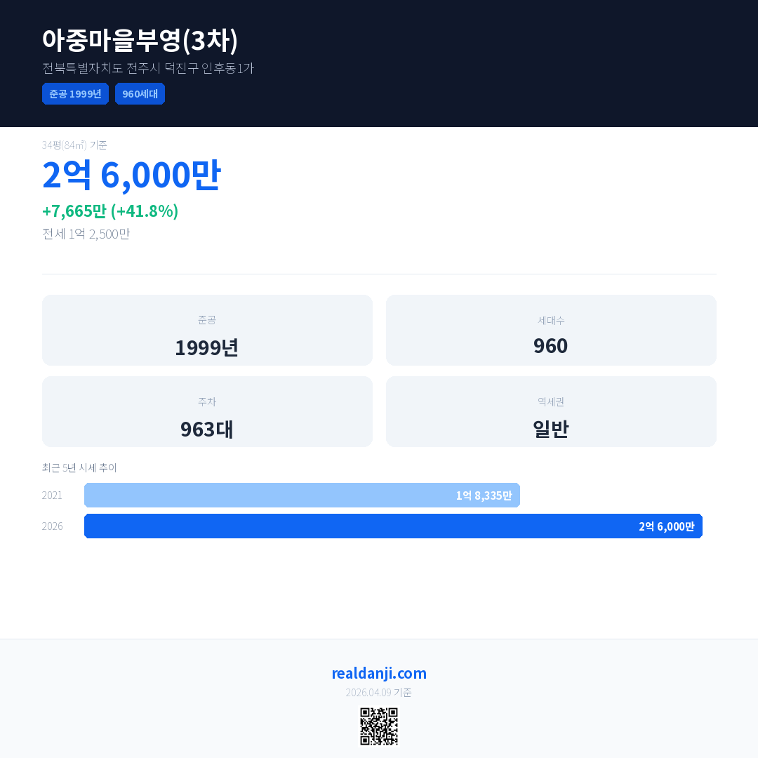 아중마을부영(3차) 국민평형 기준 2026년 평균 거래가는 2억 6,000만으로, 전년 대비 41.8% 상승 했습니다.