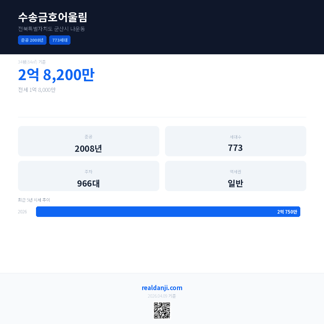수송금호어울림 국민평형 기준 2026년 평균 거래가는 2억 750만으로, 전년 대비 4.6% 상승 했습니다.