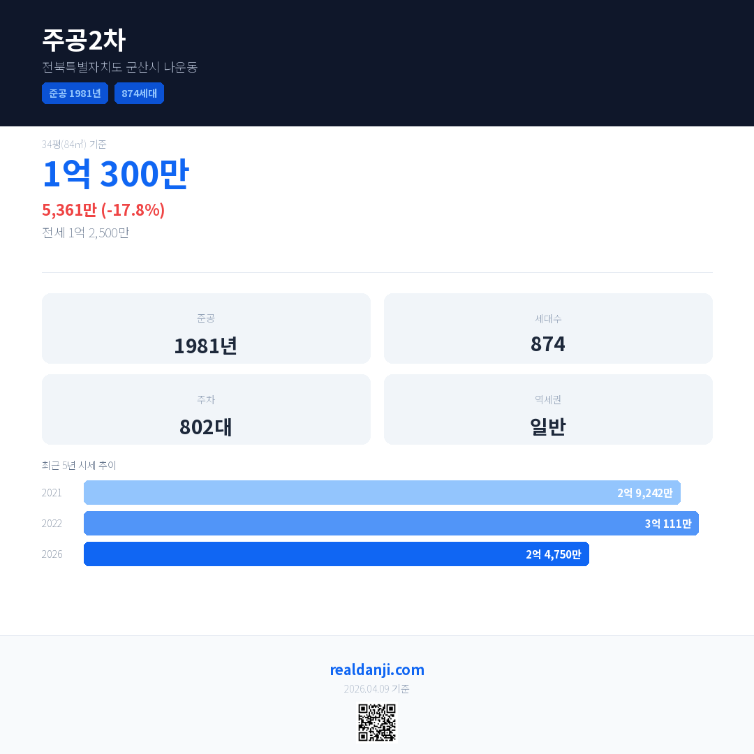 주공2차은(는) 1981년에 준공되었으며, 현재 45년차입니다. 총 874세대 규모입니다.