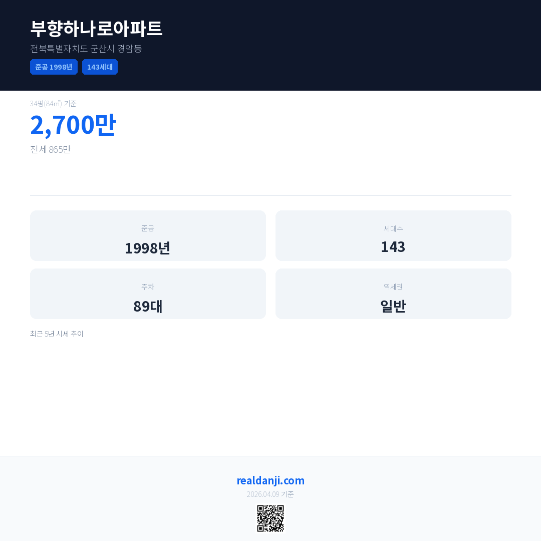 부향하나로아파트은(는) 1998년에 준공되었으며, 현재 28년차입니다. 총 143세대 규모입니다.