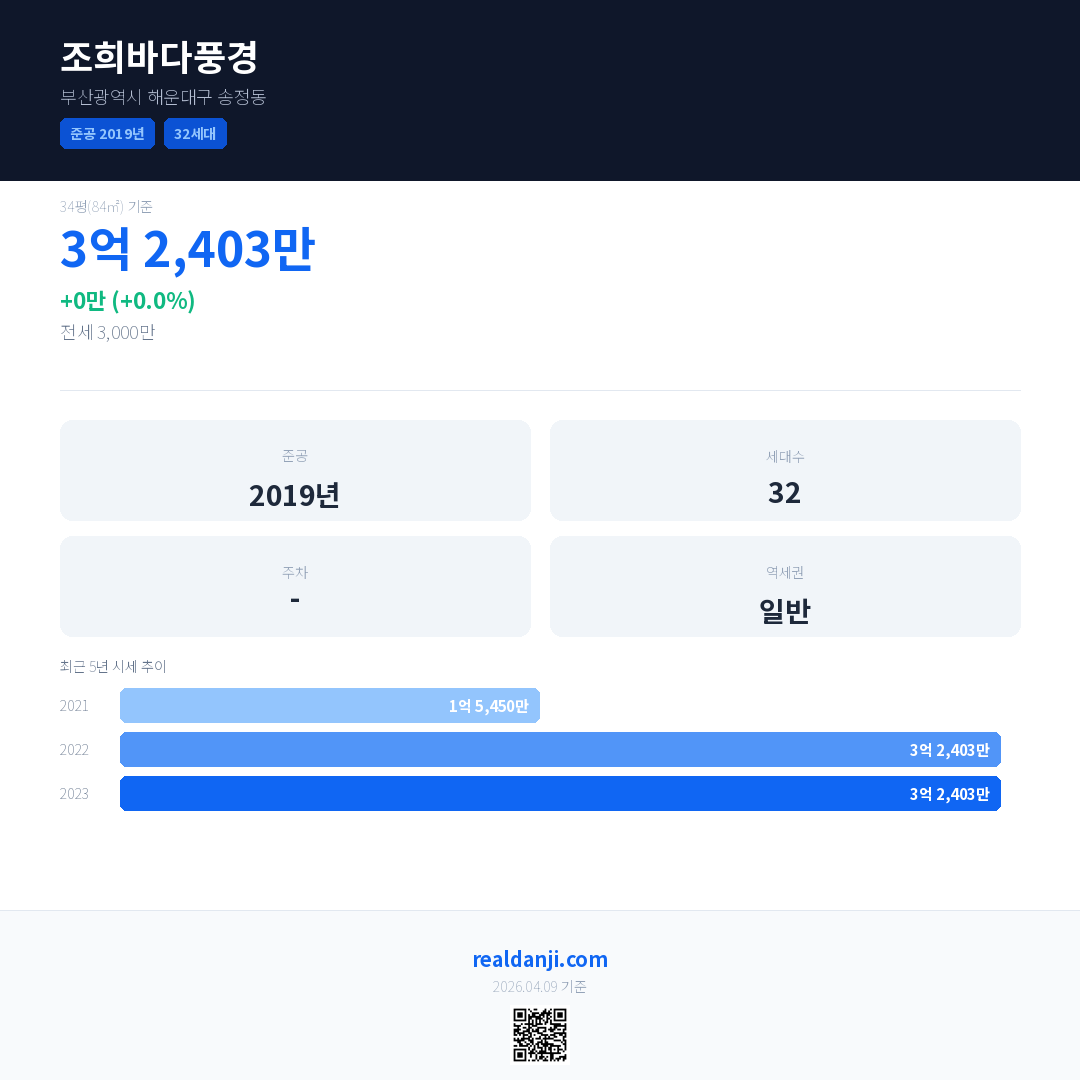 조희바다풍경 국민평형 기준 2023년 평균 거래가는 3억 2,403만으로, 전년 대비 0.0% 하락 했습니다.