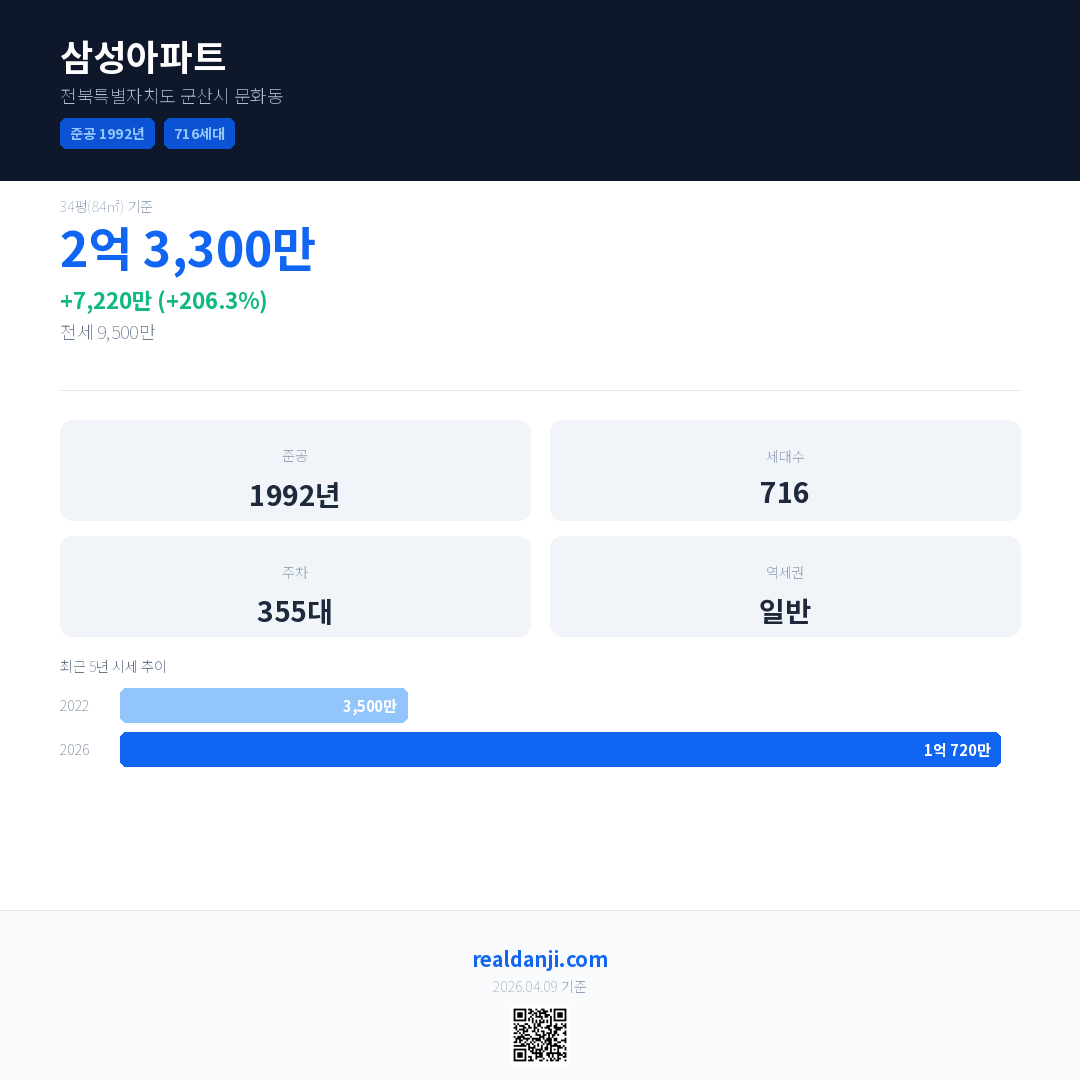 삼성아파트 국민평형 기준 2026년 평균 거래가는 1억 720만으로, 전년 대비 206.3% 상승 했습니다.