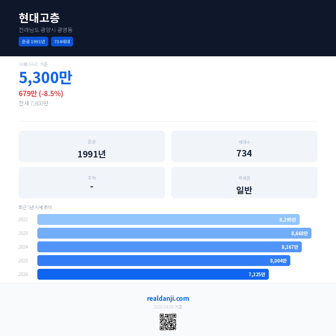 현대고층 국민평형 기준 2026년 평균 거래가는 7,325만으로, 전년 대비 8.5% 하락 했습니다.