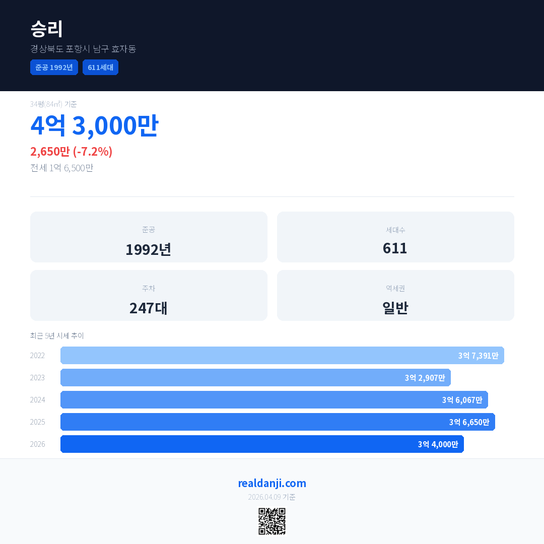 승리 최근 거래가는 4억 3,000만입니다. (2026-02)